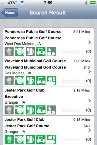 Got that powerful golfing jones and I booked out of work to get in 9 holes as it hit 78 degrees today in Des Moines. As I was tooling down the expressway, I couldn’t remember the exit. My car’s GPS only has eateries. I open up Where to Golf, press “location” and find Waveland -my destination. I choose map and voila -came up on Google Maps app -it took one more button click to get a route and the exit. Amazing!