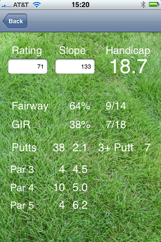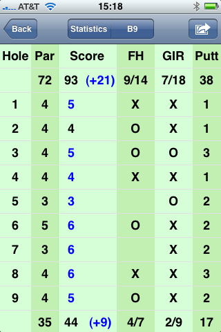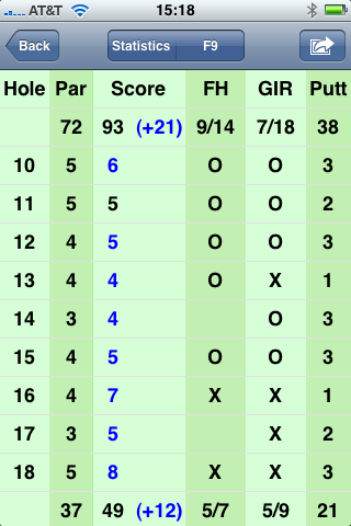 The View Ti Golf’s strength is as much in its scorekeeping functionality as in the yardage by GPS. The round I played today at The Legacy in Norwalk, IA, was an evolutionary step. First -the front nine was a better round on several measures – there was only two three putts, and I putted 17 times -under the 18 putt goal. The back nine was another story. The last three holes were played in 8 over par. This is in distinction to the first six holes played in 5 over par. Overall, I was striking the ball purely and was in fact made seven of 18 GIR’s which is pretty good. I had three or four up and downs -these aren’t tracked explicitly in View Ti, but hinted at by the one putts. The things I have to work on can be summarized by the stats screen to the right: