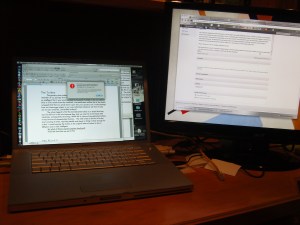 The Macbook Pro, despite being 2 years old, is still lightning fast and eminently sufficient for what I need to do. Docked here to a 23 inch monitor, it basically functions as an iMac, but mobile, it is wonderful to sit down in a comfortable chair and compose.