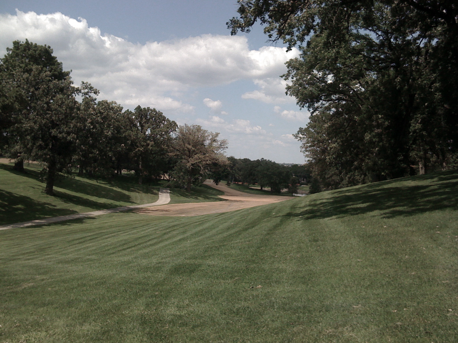 This picture above shows #1 at Wakonda during the time when the fairways were being reseeded with a new hybrid bent grass. The hole is a dogleg left with a hump of about 10 foot tall and forty yards long, transecting the fairway of the dogleg’s bend. This small hill acts as a shield, and most average drives of 230 yards drawn or hit into this mound will roll right, and leave an approach with an uphill lie and greater than 150 yards (the marker is on the upslope of this inclined impediment). When I first played this hole ever five years ago, I looked out and saw the dogleg and the trees marking the bend, and I thought -“jack it over those trees with a draw” and I did, leaving me with a 100 yard pitch. When I later explained to an established member, he looked at me with some concern, and said, “you can’t do that!
