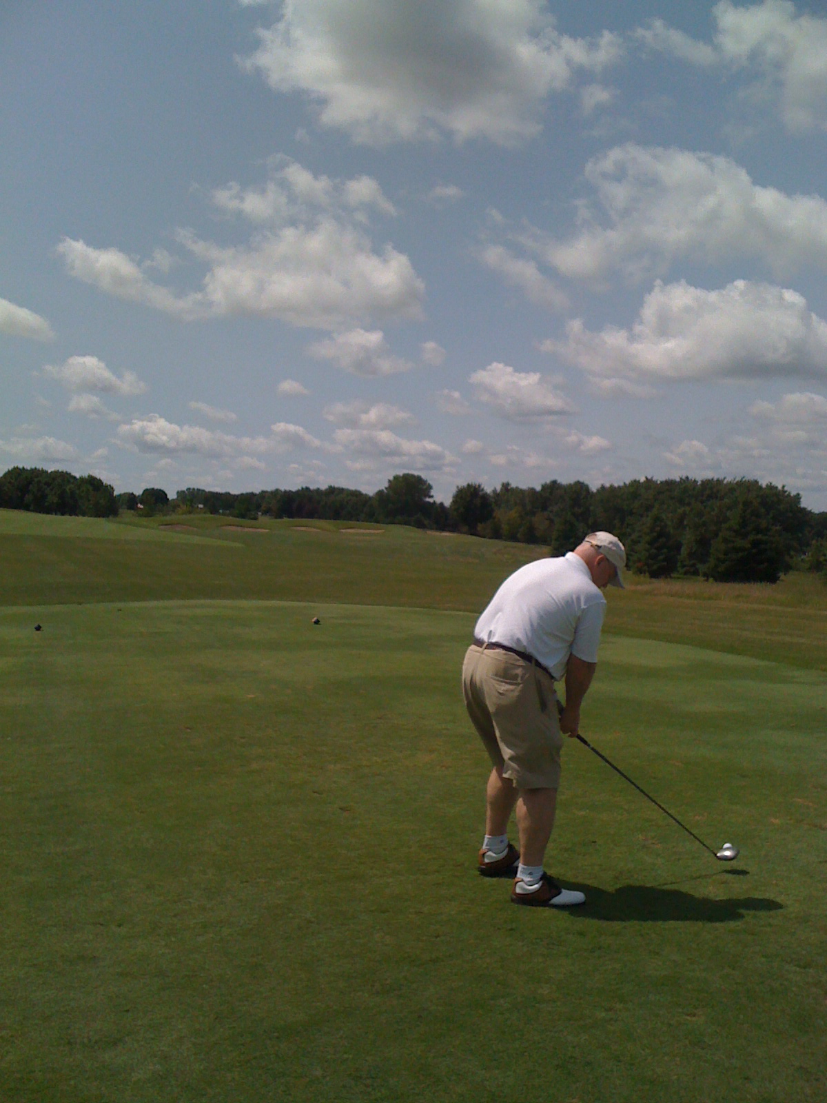 Carrying the drive over the second bunker 250 yards would set me up very nicely. I aimed over the rightmost bunker and set up my draw which had been behaving most of the front nine and I clocked the drive and ended up on the left fairway about a 100 yards from the pin, setting up sand wedge approach from a downhill lie which i placed 10 feet from the pin. Unfortunately, I two putted for a par. The greens at DMGCC are all tricked out because the property is build on cornfields and feature false fronts and anatomically correct curvatures, apertures, nooks, and crannies.