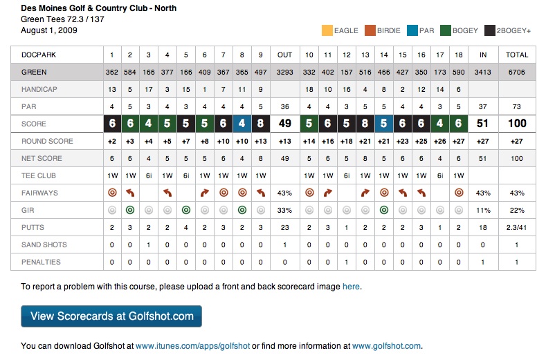 The only shoutout I have to both software houses is why with all the fancy GPS do I have to select the course that I am on. When I am on the first tee of DMGCC’s North Course, the iPhone has that information, but I still have to wait and get the list of “nearby courses” and then select the correct course. Also, the scores should be dumping into the USGA handicapping database along with course, slope, and handicap.